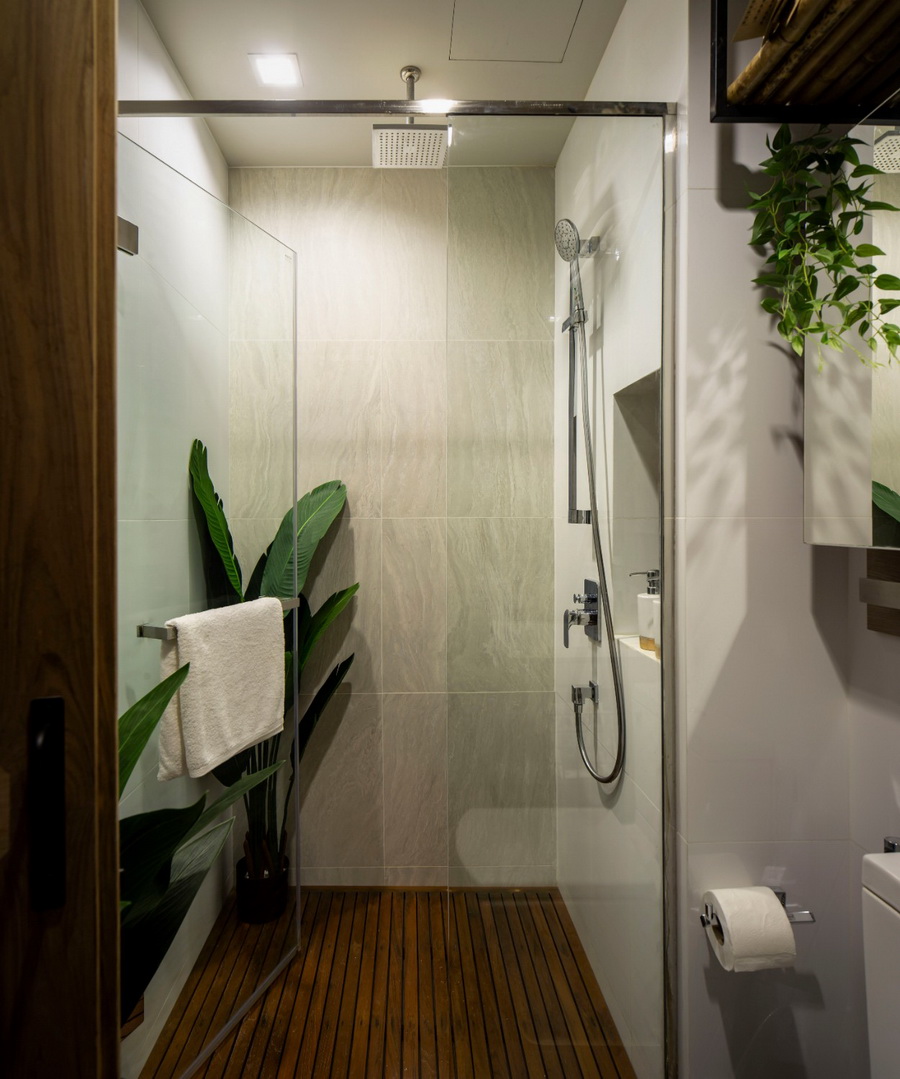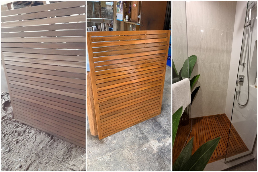 ระแนงปูพื้นส่วนอาบน้ำ(7) เดิมแล้วส่วนอาบน้ำนี้จะเป็นพื้นกระเบื้องโล่งๆเลยครับ ใจจริงแล้วอยากจะทำบริเวณ Shower box นี้เป็นแบบระแนงทั้งช่องเลยด้วย แต่คิดว่าน่าจะเรื่องใหญ่ และงบก็น่าจะไปไกล ก็เลยเซฟด้วยการปูเฉพาะแค่พื้น จะยกทำความสะอาดก็ไม่มีปัญหา และหาร้านที่รับงานไม้สักสั่งทำตามขนาด ซึ่งวัดเองอีกแล้วครับ แต่จุดนี้ไม่มีปัญหาที่ขนาด มีปัญหาตรงสี ที่เราแจ้งไปว่าไม่ต้องทาเคลือบหรือทำสีนะ อยากได้แบบดิบๆเหมือนประตู แต่ก็ได้มาแบบเงาวิบวับกันเลยทีเดียว แต่ฟีลก็พอถูๆไถๆได้อยู่ครับ