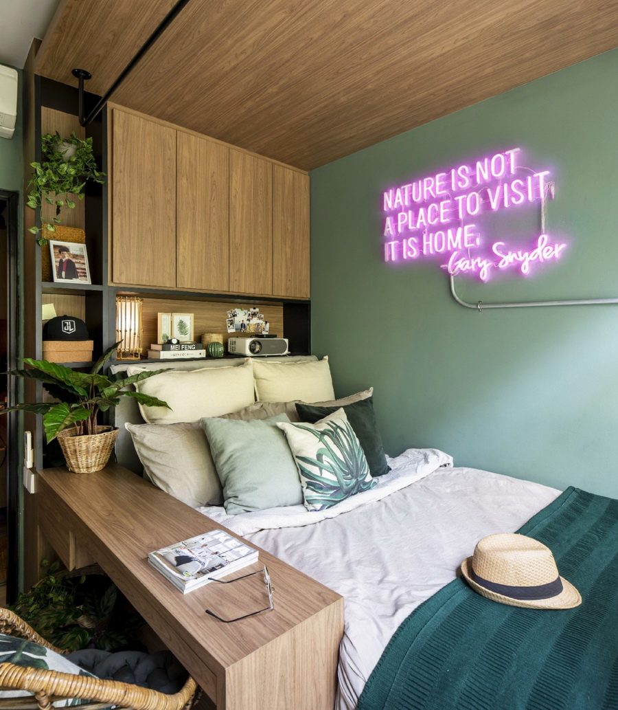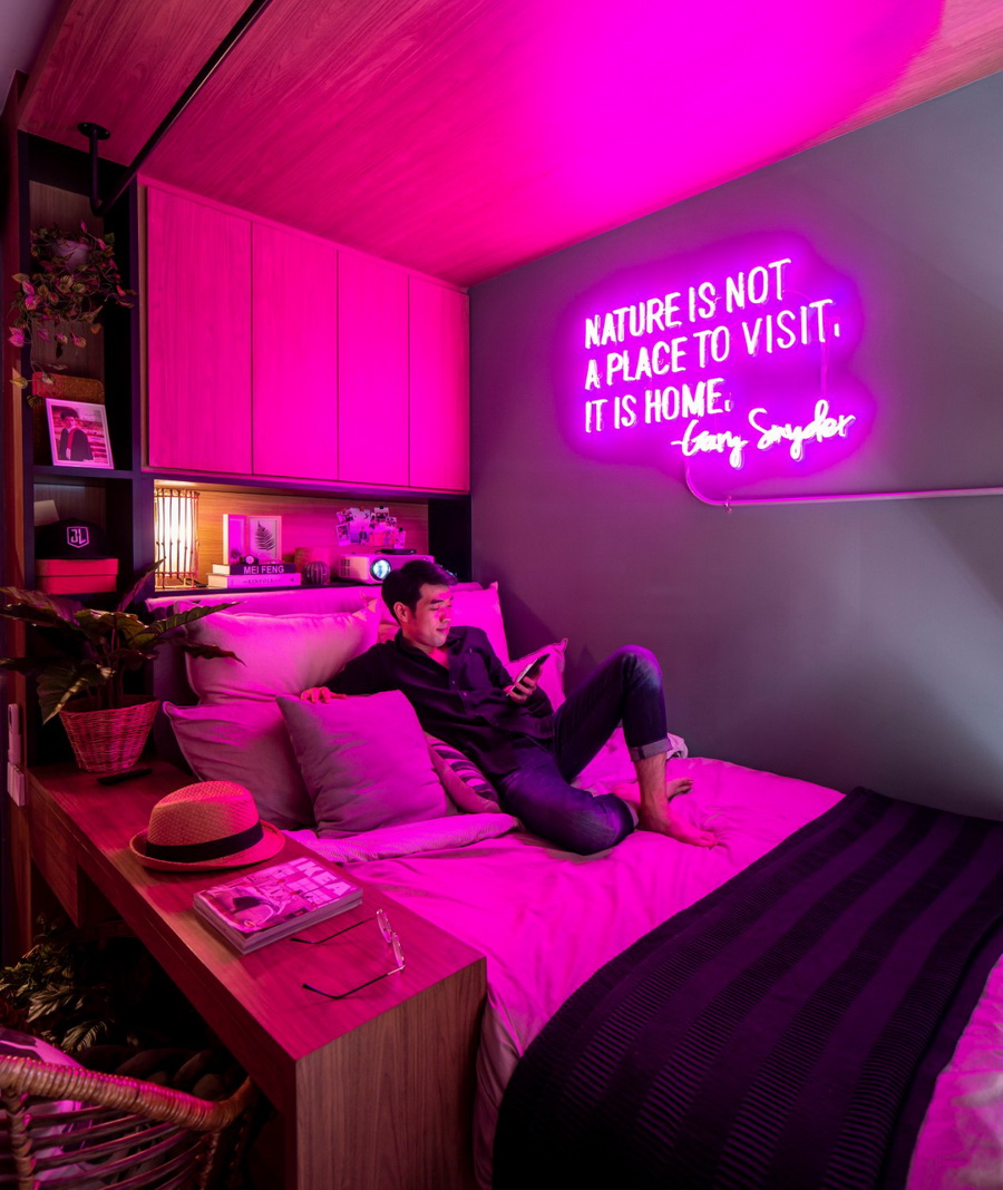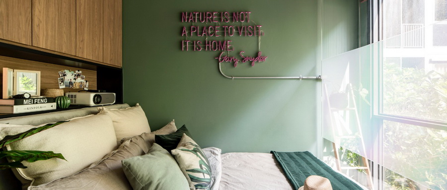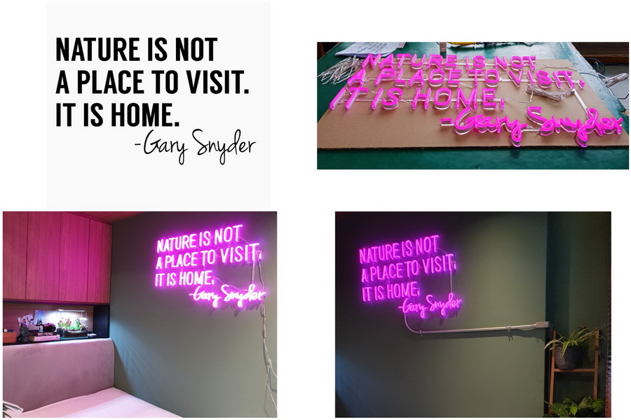 ต่อมาเป็น ไฟนีออนดัด(11) กับ quotes เท่ๆ ที่เสิร์ชหาได้โดยบังเอิญในเน็ตครับ ซึ่งเป็นของ คุณ Zack Snyder ครับ ผิดๆ55 Gary Snyder ครับ เป็นนักกวีชาวอเมริกัน รวมถึงเป็นนักเคลื่อนไหวทางด้านสิ่งแวดล้อมด้วย ที่เราอ่านแล้วก็รุ้สึกเข้ากันกับบรรยากาศห้องเรามากครับ ก็หาร้านและส่งแบบที่ทำไว้ โดยสายไฟก็เดินด้วยท่อเหล็กติดลอยดิบๆสไตล์ลอฟท์ให้เชื่อมโยงกับธีม และตรงส่วนห้องนั่งเล่น ได้ฟีลคาเฟ่ส่วนตัวเพิ่มขึ้นมาเลยใช่มั้ยครับ