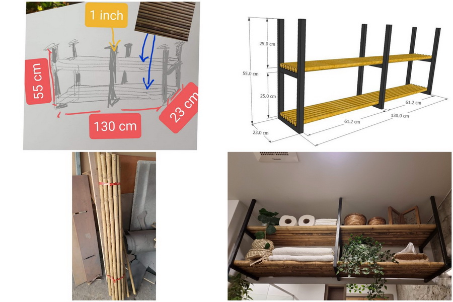 ถัดมาจะเป็น ชั้นวางของวางพรอพ(8) เหนือตู้เก็บของเดิมของโครงการครับ ตัวนี้ก็สั่งทำไปตามแบบครับ คิดเอาเอง วาดเอาเอง ฮ่าๆ ก็ได้ร้านที่เขารับทำเป็นเจ้าประจำที่เคยออเดอร์งานเหล็กต่างๆในห้องนี่แหละครับมาช่วยไว้ งานออกมาค่อนข้างพอใจตามที่คิดไว้เลยครับ จะเป็นการใช้ตัวท่อนไม้ไผ่แช่น้ำยากันมอดเสริมกับโครงเหล็กครับ เพื่อจะให้อยู่ในธีมทั้ง Tropical และ Loft ของห้อง