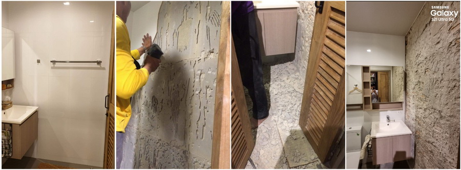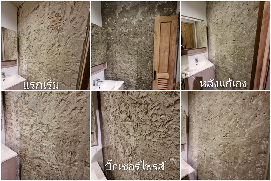 ซึ่ง ก็จบด้วยนี่แหละครับ งานนี้ ปัญหาจุดนี้ ไม่รวมเรื่องเวลางานที่เลตกว่าที่ตั้งไว้นะครับ รอบแรกที่กระเทาะได้หน้าแบบที่ชอบเลย แต่ก็มีบางจุดที่ยังต้องเก็บ อย่างส่วนที่กระเทาะถึงชั้นอิฐ โดยต้องเก็บงานในวันถัดไป ให้ช่างปูนมาทำต่อ ด้วยเราก็ติดงาน เลยบรีฟงานไว้กับช่างที่คิดว่าค่อนข้างละเอียดแล้ว และกลับไปทำงานปล่อยช่างทำไป (เตือนว่าอย่าหาทำ) กลับมาเจอบิ๊กเซอไพรส์ครับ เป็นดังภาพ ยืนอึ้งอยู่พักนึง ...ขอเกรียงฉาบปูนช่างลงงานเองเลยครับคราวนี้ ฝุ่นปูนคลุมตั้งแต่หัวยันตาตุ่ม ซึ่งท้ายสุดแล้วแก้ได้เท่านี้ด้วยตัวเอง ก็คงต้องยอมแหละครับ เหนื่อยเอาการ