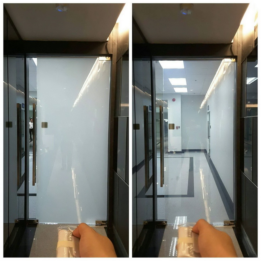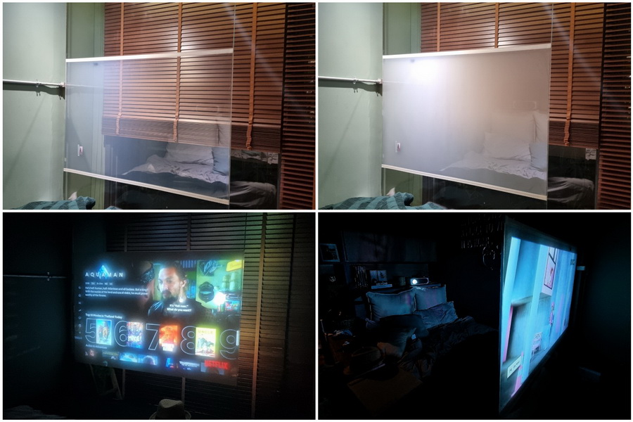 ส่วนถัดมาจะเป็นตัวช่วยรับภาพขึ้นกระจกได้ ก็คือตัว ฟิล์มติดกระจก(13.2) นะครับ เท่าที่ศึกษาดูจะมีอยู่สองแบบ คือฟิล์มแบบใสๆ Transparent Rear Projection Film จอจะใสภาพจะดูลอยๆ อารมณ์แบบภาพ Holographic เลย กับ อีกตัวจะเป็น Smart film จะเป็นฟิล์มไฟฟ้า ต้องเสียบปลั๊กครับ ความเจ๋งอยู่ตรงนี้แหละครับ ตัวฟิล์มสามารถเลือกได้ว่าให้เป็นขุ่นฝ้าๆสำหรับฉายภาพหรือต้องการ privacy ได้ หรืออยากชมวิว ก็สามารถกดสวิชต์ให้ไฟเข้าเพื่อให้ใส เพื่อชมวิวและความโปร่งโล่งได้เหมือนกัน บางคนอาจเคยเห็นกันมาบ้างแล้วตามห้องน้ำโรงแรม หรือห้องประชุมตาม บ.ต่างๆ ทั้งนี้ฟิล์มทั้งสองตัวจะใช้ได้ดีหรือฉายได้ชัด จากการยิงโปรเจกเตอร์แบบฉายหลังนะครับ ซึ่งก็คือส่วนที่สามนี้ครับ