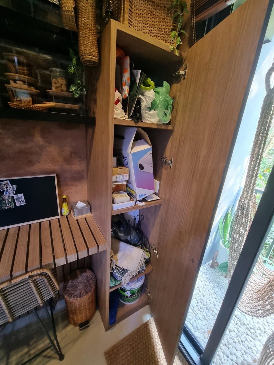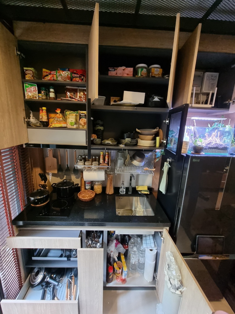 ผมแนะนำให้มีตู้บิวต์หรือที่สำหรับเก็บของใช้เยอะๆครับ ของใช้เก็บตู้ ของแต่งวางโชว์ เลือกของพยายามอย่าหลุดธีม ของใช้ต่างๆครีม เครื่องปรุง ของจุกจิก คุมธีมไม่ได้ก็เปลี่ยนถ่ายใส่บรรจุภัณฑ์หรือภาชนะที่เข้าธีมห้อง และเก็บให้เป็นที่ และทวนไปที่ข้อของใช้เก็บเข้าตู้ ของแต่งเอาวางโชว์ครับ ฮ่าๆๆ นี่คือสภาพของที่ยัดๆอยู่ในตู้ครับ ยอมพลีชีพให้ดูครับ