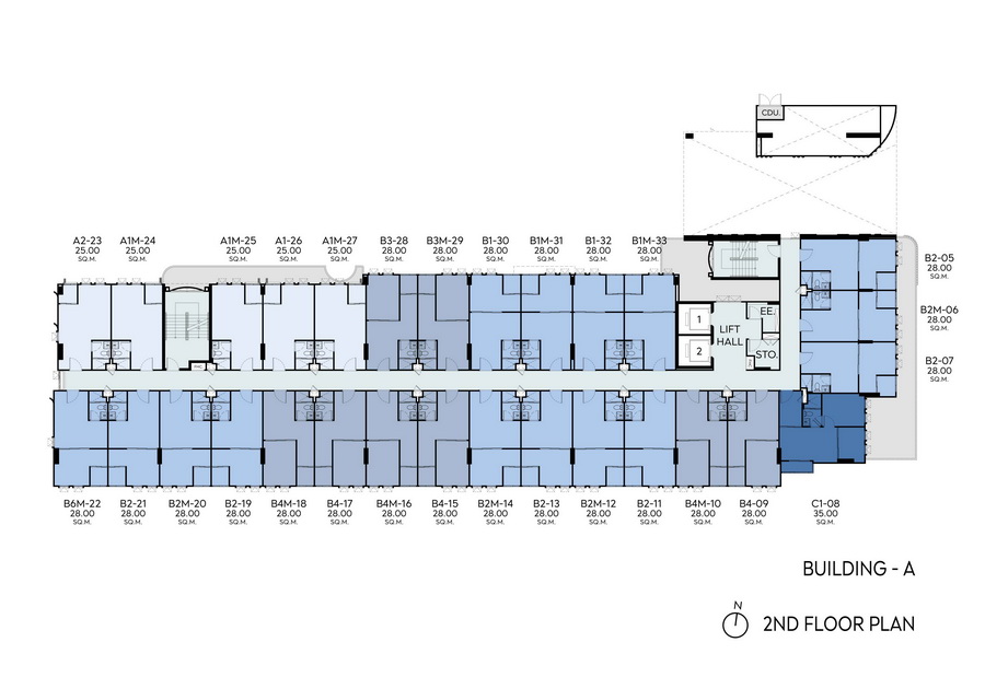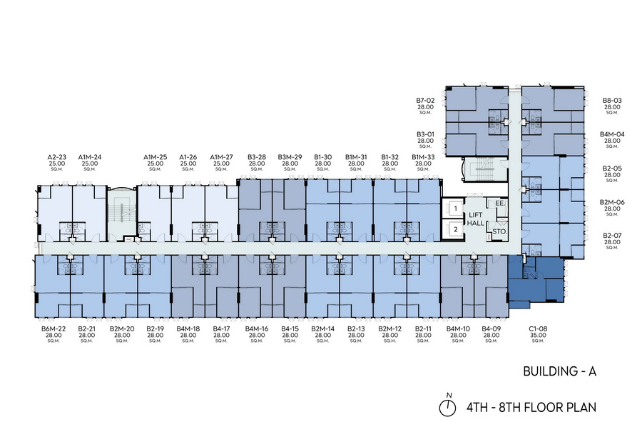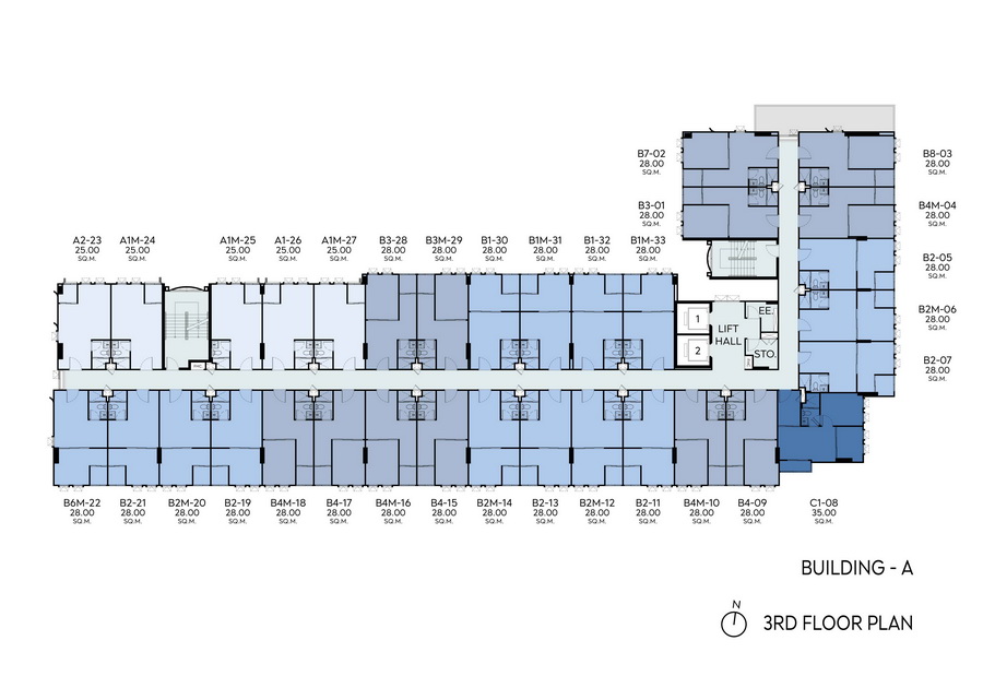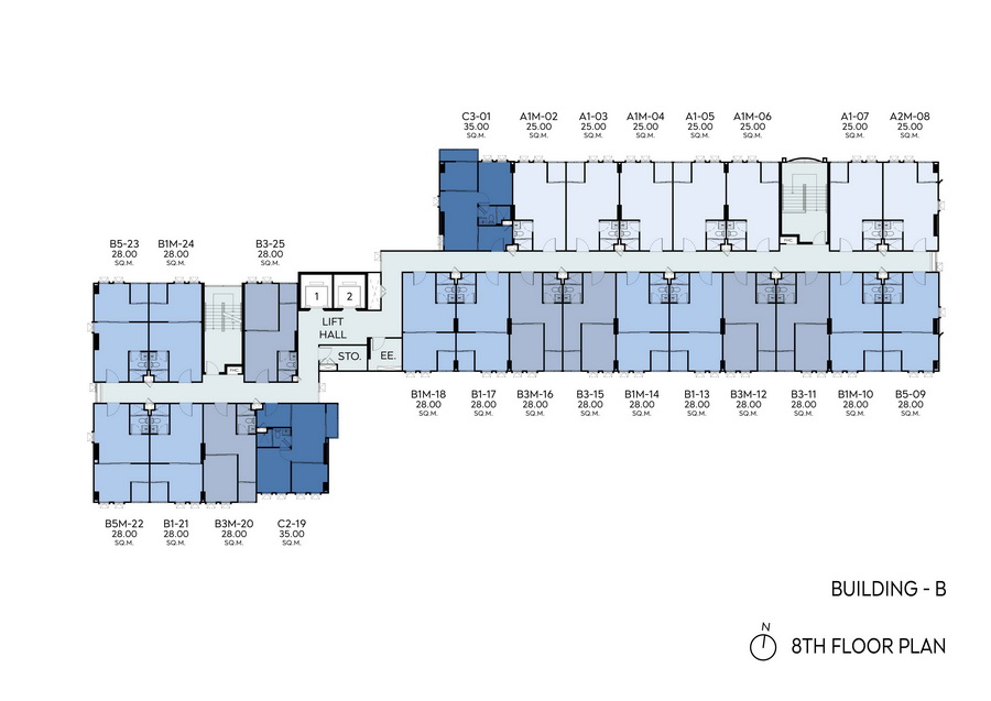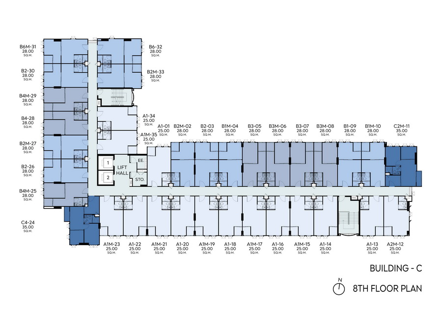 • อาคาร A, B และ C ชั้น 2-8 เป็นชั้นพักอาศัย, ห้องไฟฟ้า, ห้องพักขยะ และพื้นที่จัดสวนที่ชั้นหลังคาของอาคาร A