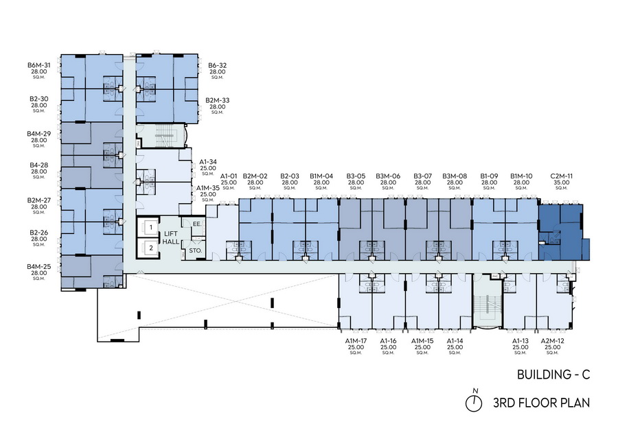 • อาคาร A, B และ C ชั้นหลังคาเป็นห้องเครื่องปั๊ม, ห้องเครื่องลิฟต์, ถังเก็บน้ำ