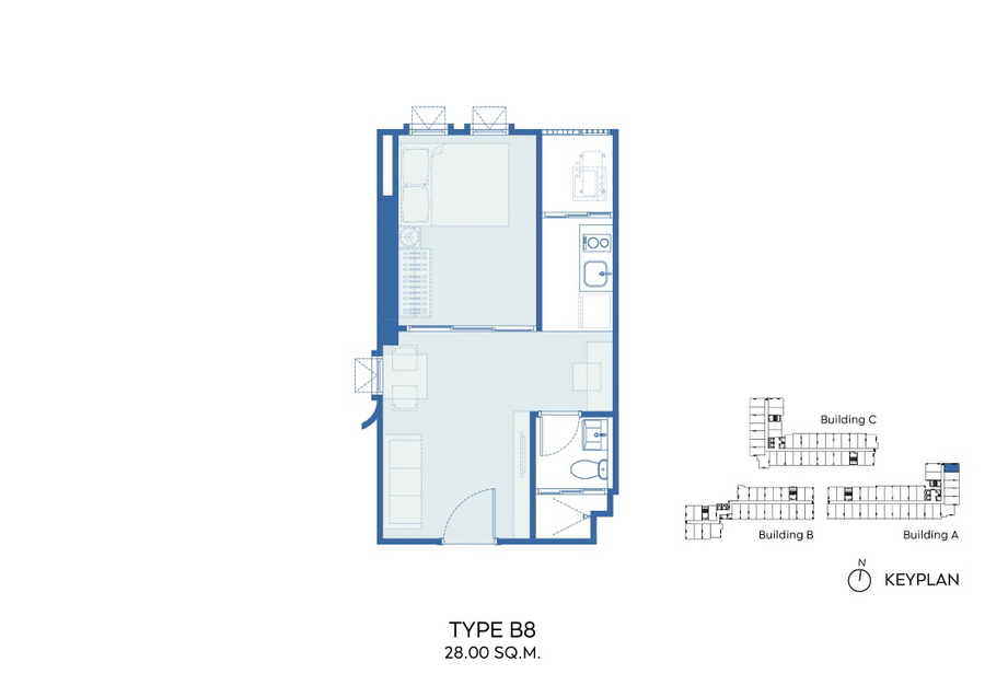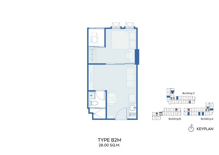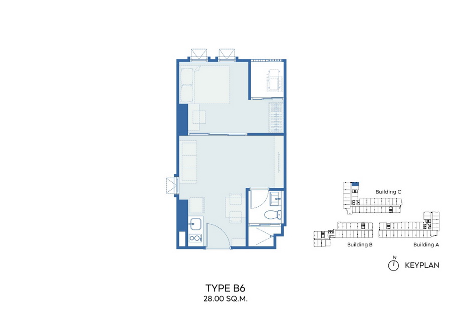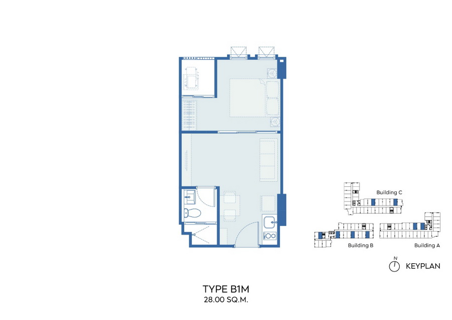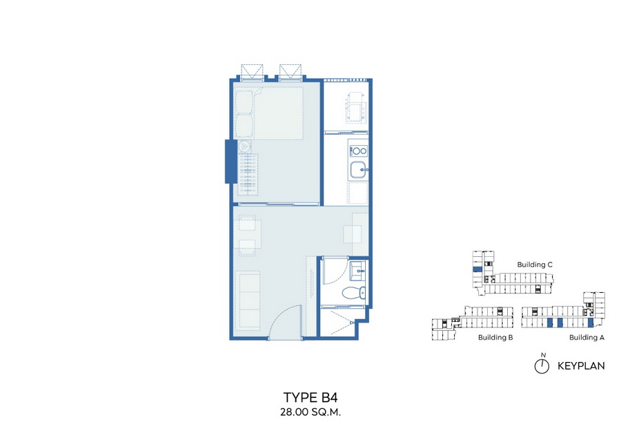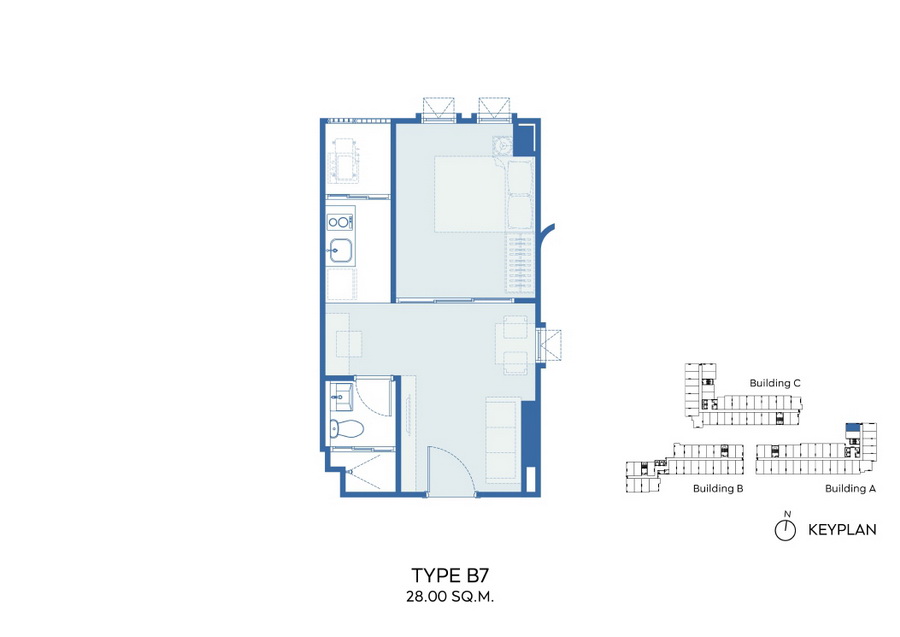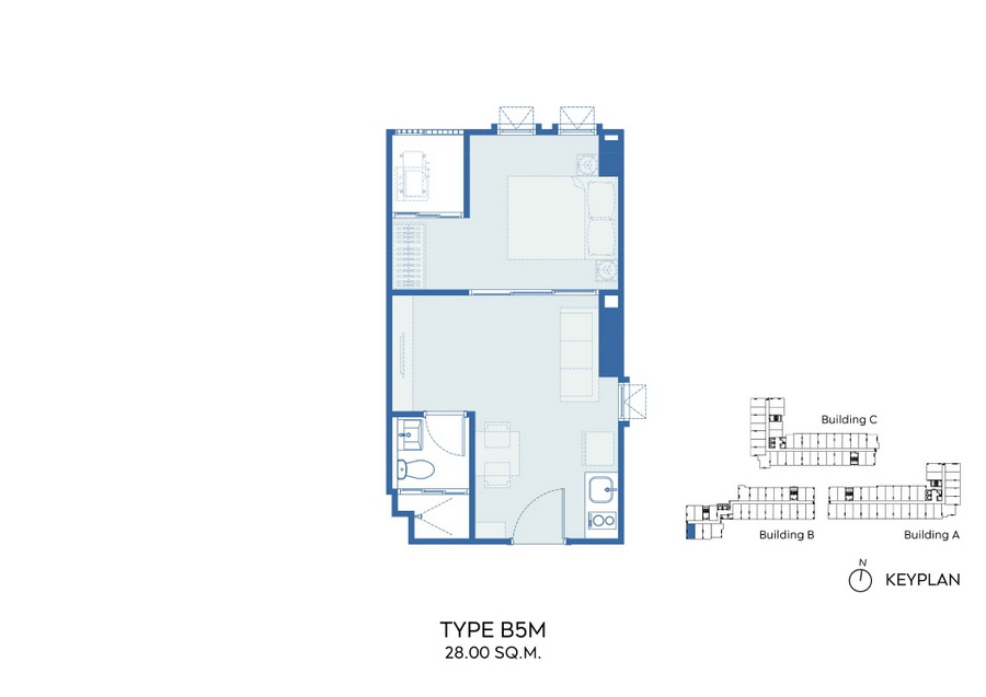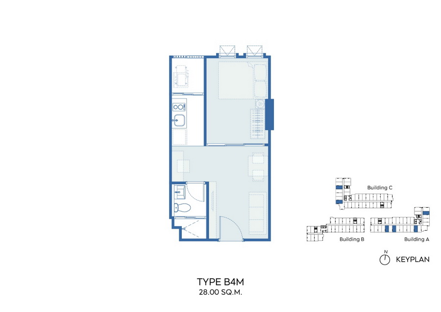 ภาพตัวอย่างห้องแบบ 1 Bed Type B3, B3M, B4, B4M ,B7 ,B8 ขนาด 28 ตร.ม. แบบมีครัวติดอากาศ