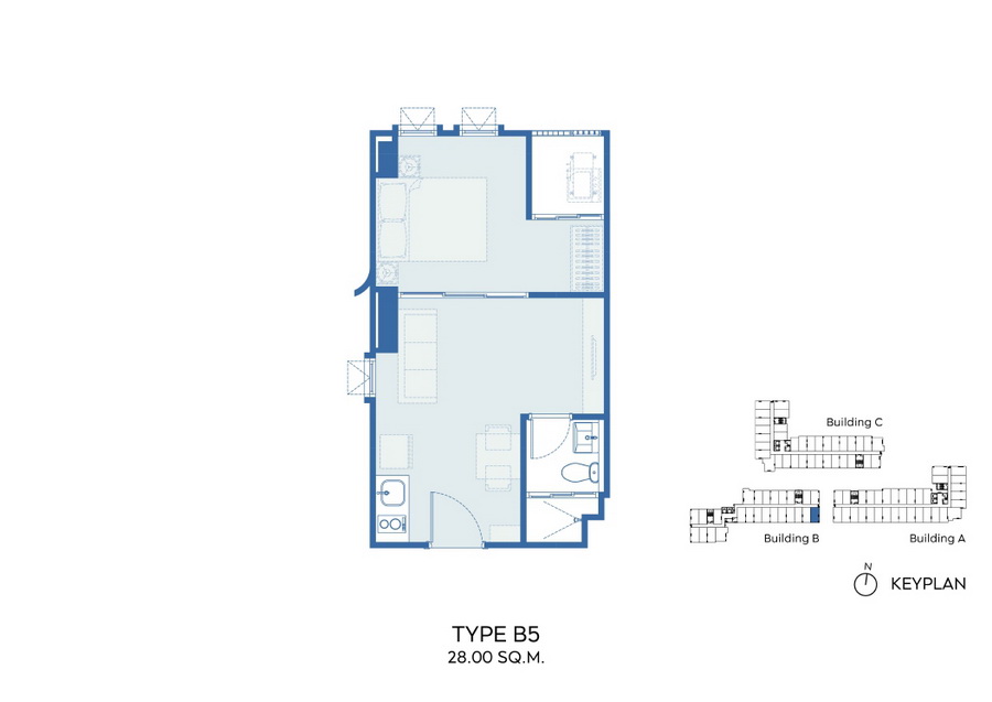 ภาพห้องตัวอย่างแบบแรก เป็นแบบ 1 Bedroom ขนาด 28 ตร.ม. แบบมีครัวติดอากาศ จะมี Type B3, B3M, B4, B4M ,B7 ,B8 ซึ่งจะมีการแบ่งพื้นที่ห้องออกเป็น 3 ส่วน คือส่วนห้องนั่งเล่นที่รวมอยู่กับห้องน้ำ, ส่วนห้องครัว กับระเบียง, และส่วนห้องนอน
