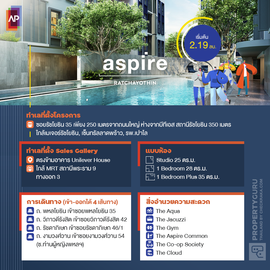 ทำเลสุดฮอตอย่าง "รัชโยธิน" กำลังจะมีคอนโดน้องใหม่เอี่ยมจาก AP (Thailand) มาเปิดตัวกันในเร็วๆ นี้ ในชื่อโครงการ แอสปาย รัชโยธิน (Aspire Ratchayothin) โดยตั้งอยู่ห่างจากรถไฟฟ้าสถานีรัชโยธินเพียง 350 เมตรเท่านั้น อีกทั้งยังห่างจากถนนใหญ่พหลโยธินเพียง 250 เมตร ทำให้การเดินทางนั้นสะดวกสบาย เหมาะกับทุกไลฟ์สไตล์ ไม่ว่าจะไปเรียน หรือไปทำงานด้วยรถยนต์ที่เข้า-ออกได้ถึง 4 เส้นทาง หรือจะเดินทางด้วยรถไฟฟ้า ก็เดินไปขึ้นได้สะดวก ความพิเศษอีกอย่างคือแนวคิดการออกแบบห้องแบบ Minimum Space at Maximum Use คือการใช้ทุกพื้นที่ใช้สอยให้คุ้มค่าที่สุด สามารถปรับเปลี่ยนให้เข้ากับทุกการใช้ชีวิต ทำให้เราออกแบบห้องของเราได้ตามความชอบของผู้อยู่อาศัยได้อย่างไม่มีจำกัดเลยค่ะ ทั้งหมดนี้เริ่มต้นเพียง 2.19 ล้านบาทเท่านั้น เราไปรับชมความน่าสนใจของโครงการนี้กันต่อเลยค่ะ