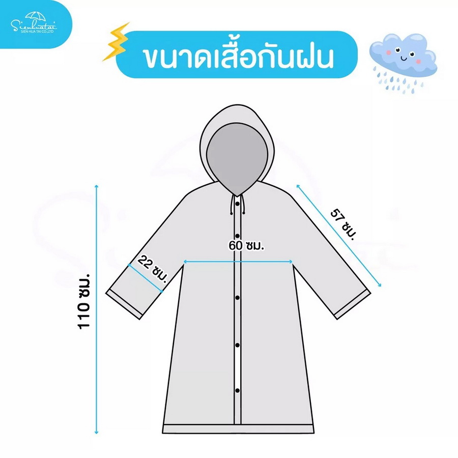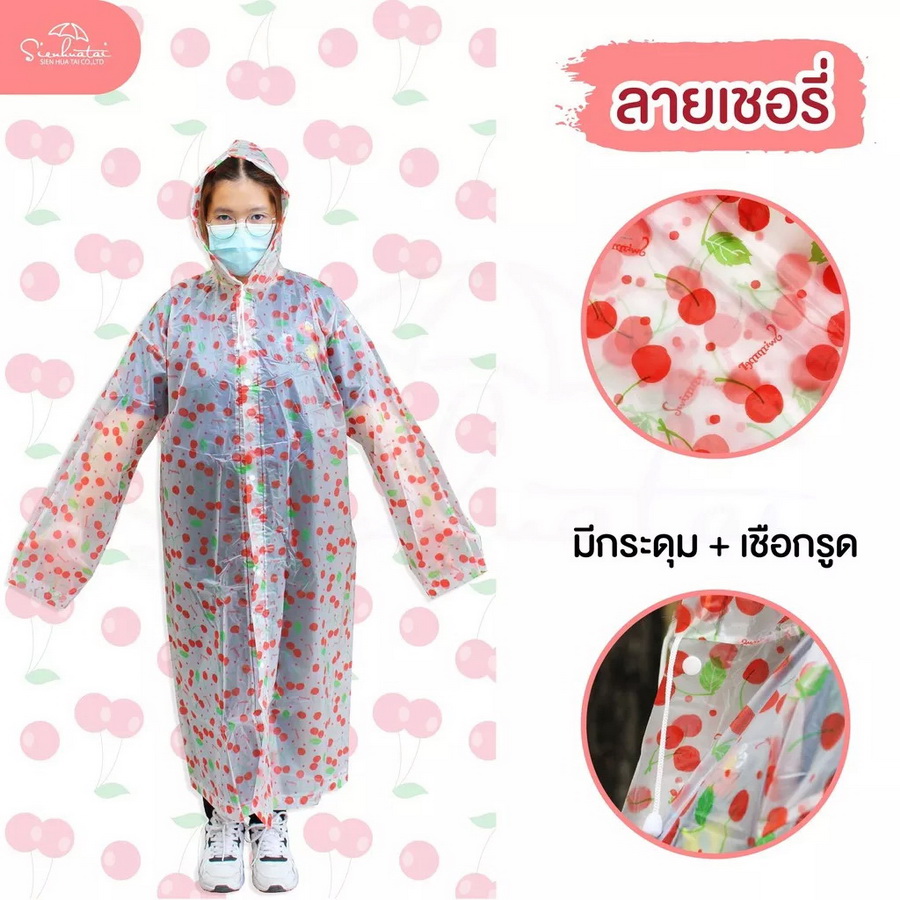 เสื้อกันฝน EVA สำหรับผู้ใหญ่ พิมพ์ลายน่ารัก ขนาดรอบอกกว้าง 60 เซ็นติเมตร รอบแขนกว้าง 22 เซ็นติเมตร แขนยาว 57 เซ็นติเมตร วัสดุทำมาจาก EVA(พลาสติกเหนียว) มีแบบให้เลือกถึง 5 แบบ ลายจุด 1 ลายจุด 2 ลายเชอร์รี่ ลายหมี และลายหัวใจ