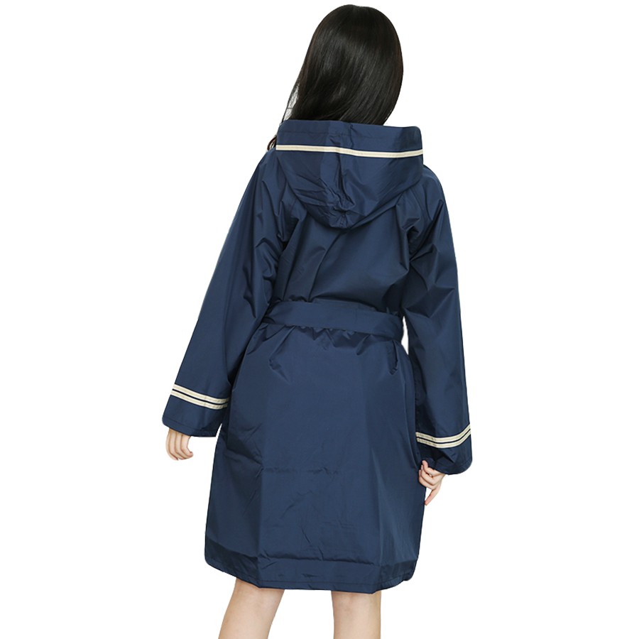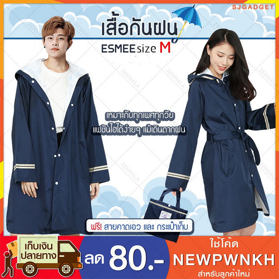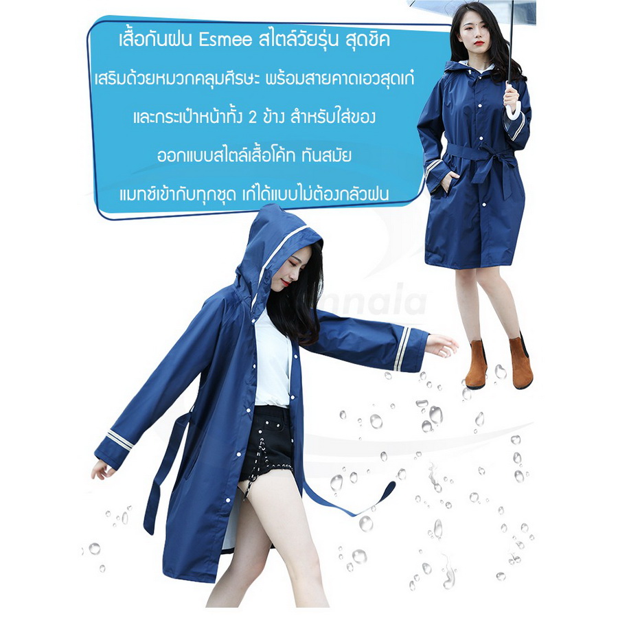 เสื้อกันฝน Esmee สไตล์วัยรุ่น สุดชิค ผลิตจากโพลีเอสเตอร์อย่างดี เนื้อหนา ยืดหยุ่น ไม่ฉีกขาดง่าย เสริมด้วยฮู้ดคลุมศีรษะ ป้องกันน้ำกันฝนได้เป็นอย่างดี มาพร้อมสายคาดเอวสุดเก๋ และกระเป๋าหน้าทั้ง 2 ข้าง สำหรับใส่ของ ออกแบบสไตล์เสื้อโค้ท ทันสมัย แมทช์เข้ากับทุกชุดเก๋ได้แบบไม่ต้องกลัวฝน