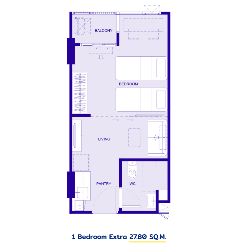 - 1 ห้องนอน เตียงคู่ ขนาดพื้นที่ใช้สอย 27.80 ตร.ม.