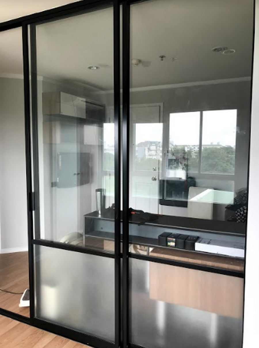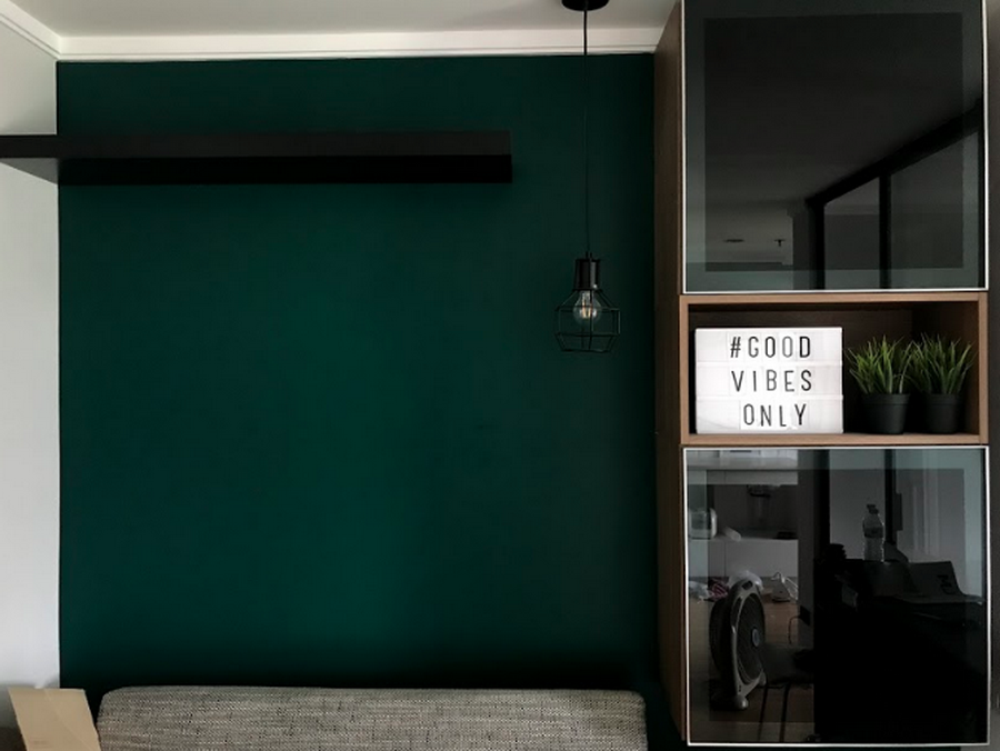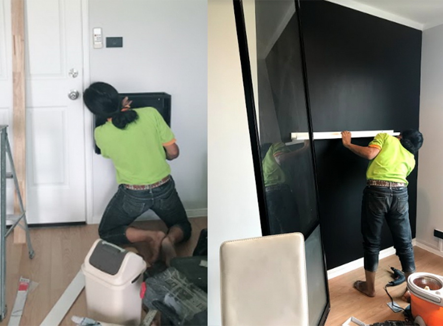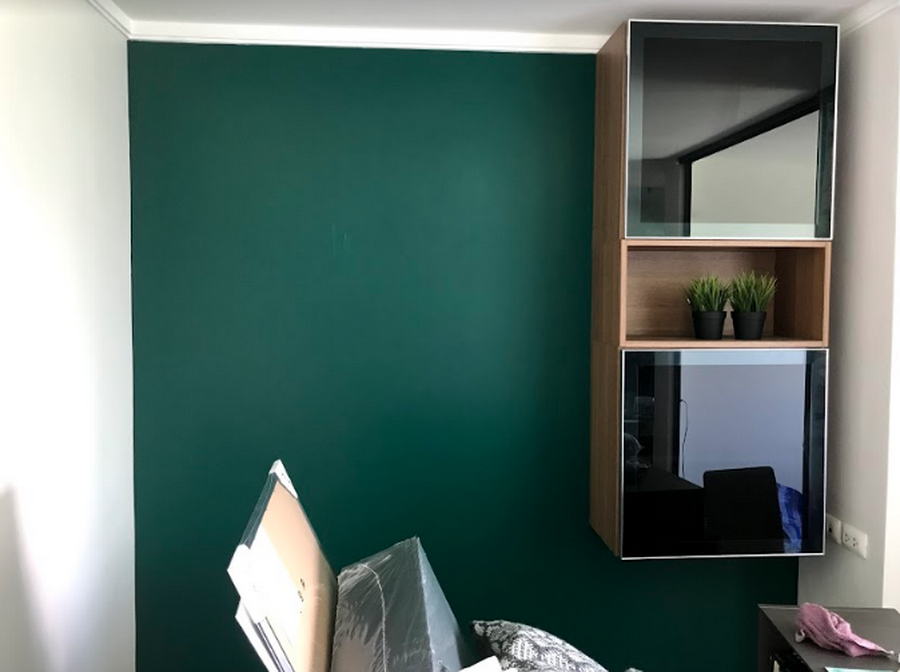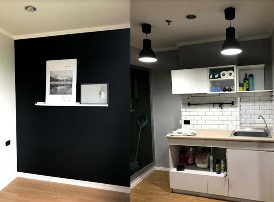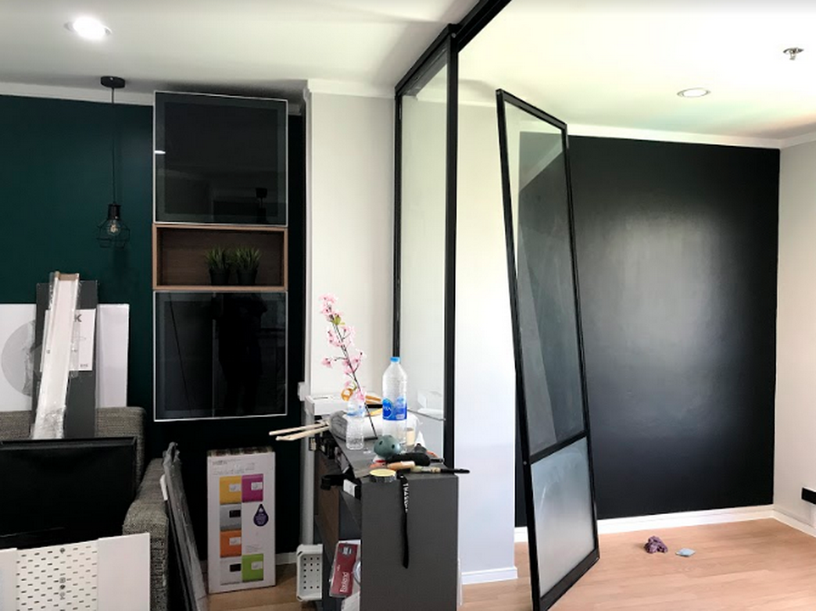 วันแรกๆ ช่างเข้ามาเก็บงานพวกรอยแตก รอยร้าว แล้วก็งานสีก่อนค่ะ ทาสีใหม่ทั้งห้อง เลือกเป็นโทน เขียวเข้ม ดำ เทาเข้ม เทาอ่อน ขาว (ไม่รู้ว่าพอจะเรียกเป็น Tropical นิดๆได้มั้ย 555) ทาสีประตูห้องน้ำ ประตูห้องด้านใน รวมถึงเปลี่ยนสีประตูบานเลื่อนเป็นสีดำด้วยค่ะ แหะๆ ไม่ค่อยชอบสีเงิน ชอบกรอบประตูสีดำมากกว่า จะเปลี่ยนใหม่ทั้งบานก็เกินงบ เลยให้ช่างพ่นสีดำให้ค่ะ ใช้เป็นสีพ่นสีดำของ TOA แบบกึ่งเงากี่งด้านค่ะ ในชุดก็จะมีทินเนอร์ด้วยที่มาผสมกับสีพ่น