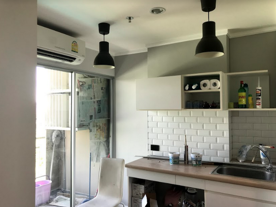กระเบื้องจะเป็นคล้ายๆซับเวย์ นูนๆตรงกลางค่ะ ติดกระเบื้องยังไม่เสร็จดี ช่างไฟก็มาต่อค่ะ ติดไฟเพิ่มตรงแพนทรี่ค่ะเป็นโคมห้อย