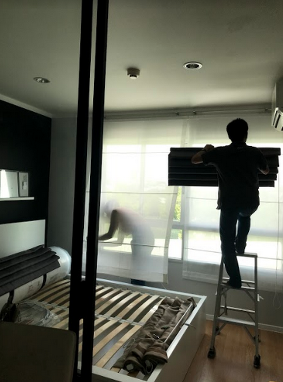 ในวันเดียวกันก็นัดให้ร้านผ้าม่านมาเปลี่ยนม่านในห้องนอนไปด้วยเลยค่ะ ตอนแรกม่านที่มากับห้องจะเป็นม่านชั้นเดียว เราเลยเปลี่ยนเป็นแบบสองชั้นค่ะ เปลี่ยนตัวผ้าเป็นสีเทาแบบไม่อมฝุ่นด้วย แต่จะติดปัญหานิดหน่อยคือในห้องเราแอร์จะติดชิดกับขอบหน้าต่างมาก เหลือไม่ถึง 15 เซ็น เลยติดราวสองชั้นไม่ได้ ทางร้านเลยแก้ให้เป็นติดสองราวค่ะ ติดแบบลดหลั่นกันมาแทนค่ะ แต่มองตรงๆก็ไม่เห็นความแตกต่างนะคะ แทบไม่ต่างกับติดสองชั้น แถมพี่ร้านผ้าม่านก็ใจดี ติดผ้าม่านม้วนตรงประตูระเบียงที่เราซื้อมาจาก IKEA ให้ฟรีด้วย ^___^