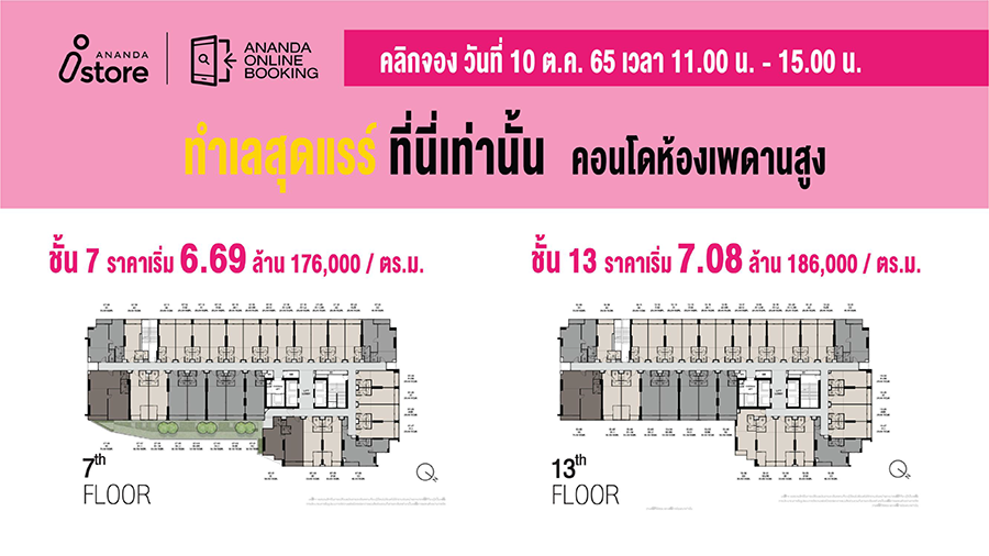 - ชั้น 13 ราคาเริ่มต้น 7.08 ล้านบาท (186,000 บาท/ตร.ม.)