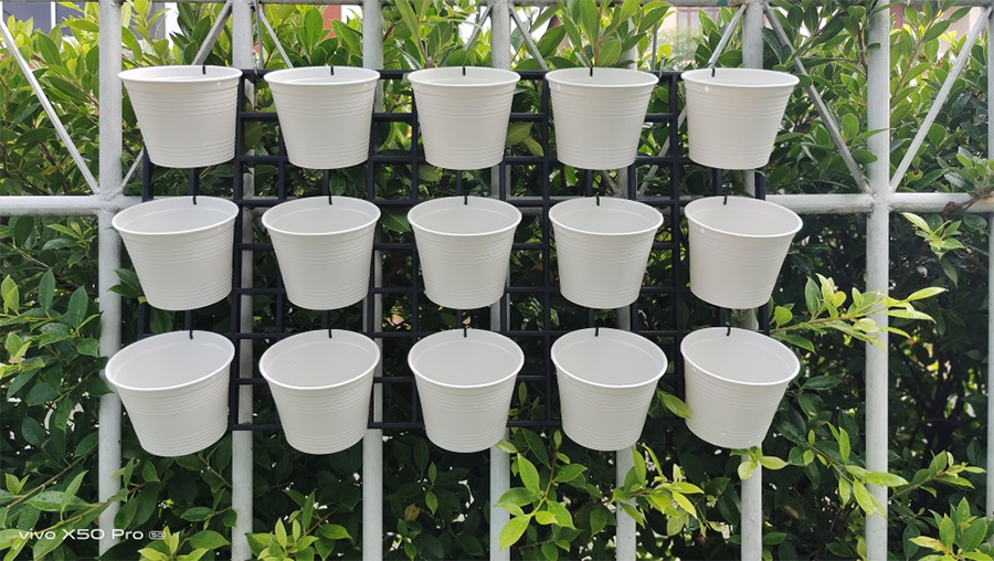 เซ็ตกระถางแขวนผนังโทนสีขาวคลีนๆ สามารถวางได้ทั้งแบบแนวตั้งและแนวนอน ในเซ็ตประกอบด้วย กระถางพลาสติกสีขาวขนาด 4 นิ้ว จำนวน 15 ใบ และตะแกรงพลาสติกสีสำหรับแขวนกระถาง