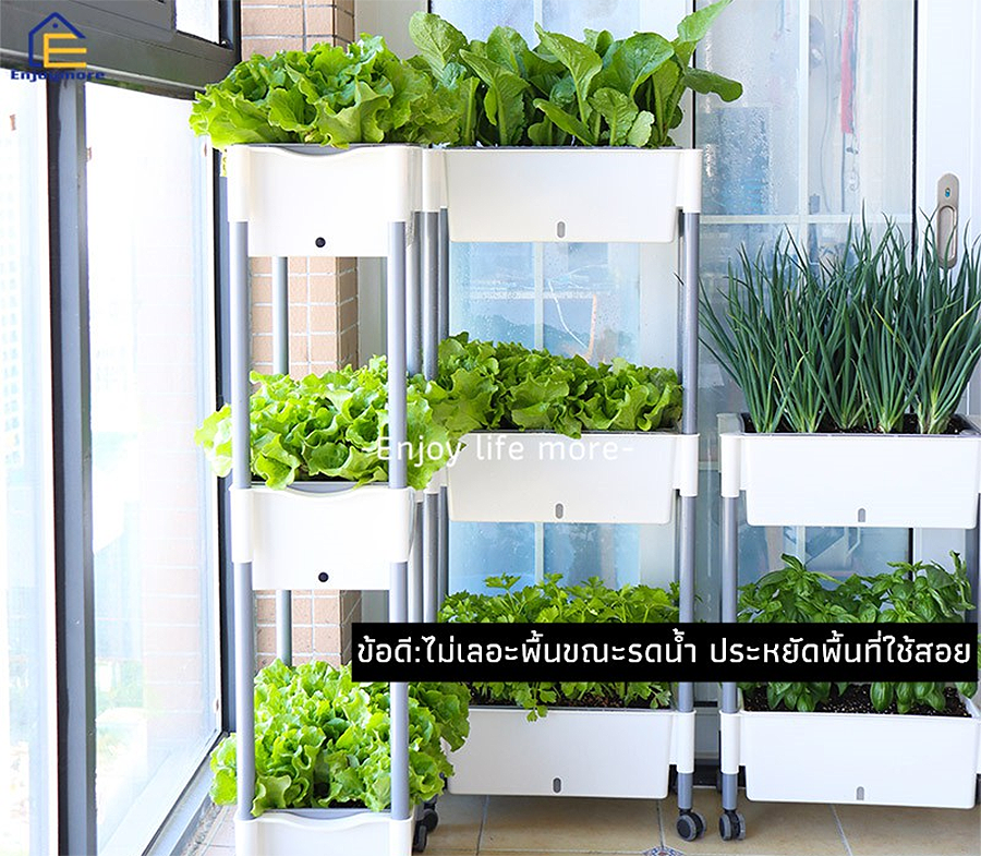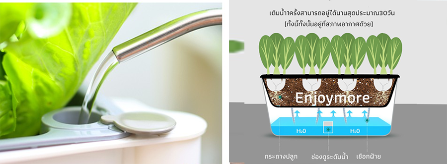 กระถางปลูกผักแบบเก็บน้ำได้ ออกจากบ้านหลายวันไม่ต้องกลัวพืชผักที่ปลูกไว้เหี่ยวแห้ง ตัวกระถางเป็นพลาสติก เติมน้ำ 1 ครั้งสามารถอยู่ได้นานสูงสุดประมาณ 30 วัน