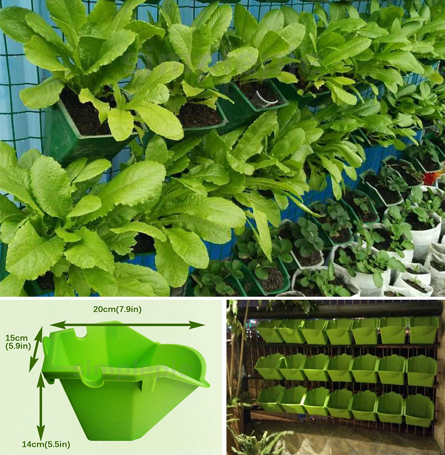 กระถางสีเขียวสไตล์โมเดิร์น ด้านหลังออกแบบเป็นที่แขวน สามารถแขวนตกแต่งระเบียงหรือตกแต่งระเบียงได้ วัตถุดิบเป็นเรซิน PP แข็งแรงทนต่อแรงกระแทกและเป็นมิตรกับสิ่งแวดล้อม ด้านล่างมีช่องระบายน้ำช่วยป้องกันไม่ให้รากเน่า