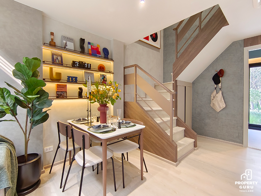 2 Bedroom Duplex 59.30 SQ.M. ตร.ม. ห้องนี้จัดเป็นแรร์ไอเทม เพราะมีเพียง 34 ยูนิตเท่านั้น เป็นห้อง 2 ชั้น ความสูงแบบ Double Volume 5.25 เมตร เฉพาะด้านบนสูง 2.45 เมตร ครัวรูปตัว L มีตู้วางรองเท้าใต้บันได ติดตั้งแอร์ให้ทุกห้อง ห้องน้ำชั้น 1 เข้าได้ 2 ทาง ห้องนอนข้างบนได้ Walk in closet