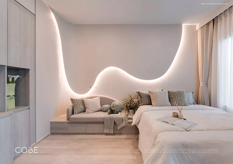 ห้องนอนที่เพิ่มลูกเล่นบริเวณหัวเตียงเป็นที่นั่งเล่น