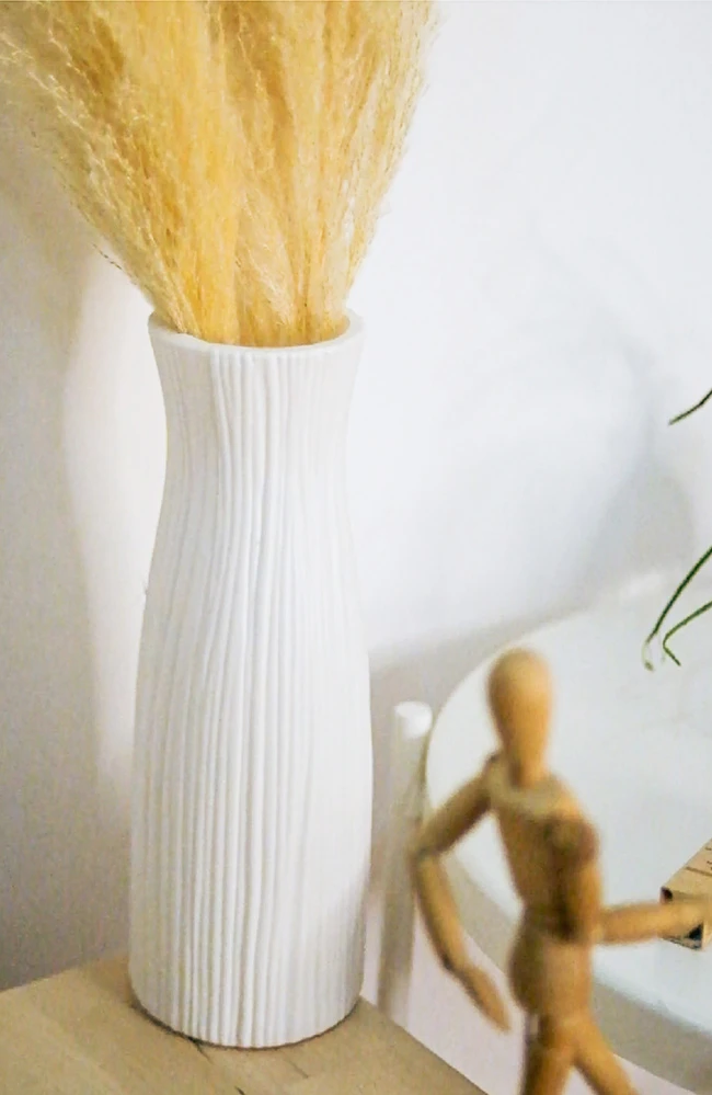 แจกันพลาสติกที่ทำลวดลายเป็นร่องเลียนแบบกับแจกันเซรามิกได้แนบเนียนมากๆ ทำให้หมดห่วงเรื่องการตกแตกและมีราคาเบากว่าหลายสตางค์เลย