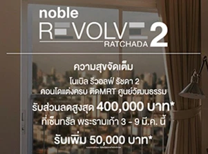 โนเบิล รีวอล์ฟ รัชดา 2 (Noble Revolve Ratchada 2) ครบทุกฟังก์ชันชีวิตด้วยคอนโดแต่งครบ ราคาเริ่มต้น 3.1 ล้านบาท จองวันนี้รับส่วนลดสูงสุด 400,000 บาท และรับบัตรกำนัลเซ็นทรัล มูลค่า 50,000 บาท สนใจเข้าชมบูธโครงการหรือสอบถามรายละเอียดเพิ่มเติมได้ที่ ชั้น 1 เซ็นทรัลพลาซา แกรนด์ พระราม 9 วันที่ 3-9 มีนาคม 2558 นี้เท่านั้น !