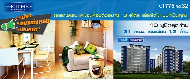 บริษัท เสนาดีเวลลอปเม้นท์ จำกัด (มหาชน) จัดโปรฯ "แต่งครบ เกินคาด" กับ เดอะ คิทท์ พลัส นวมินทร์ (The Kith Plus Nawamin) คอนโดใกล้ MRT สายสีชมพู สถานีรามอินทรา (โครงการในอนาคต) พร้อมให้เลือกแบบห้องถึง 3 สไตล์ เหลือไม่มาก แค่ 10 ยูนิตสุดท้าย เริ่มเพียง 1.2 ล้านบาท