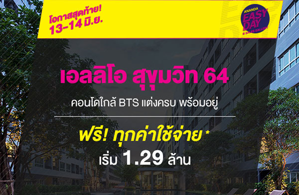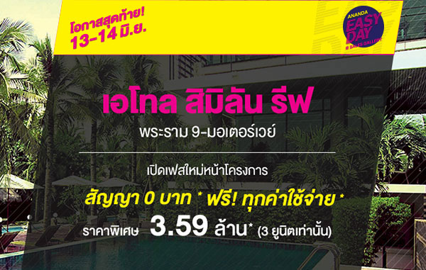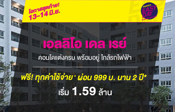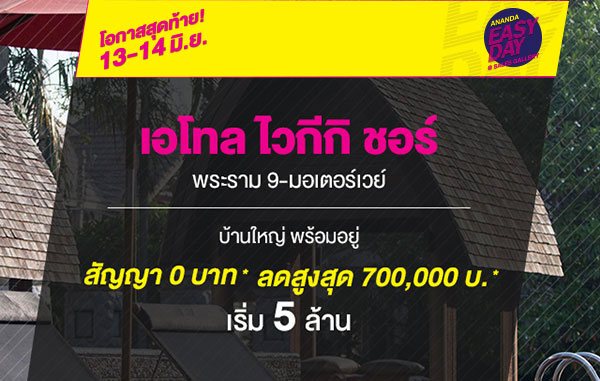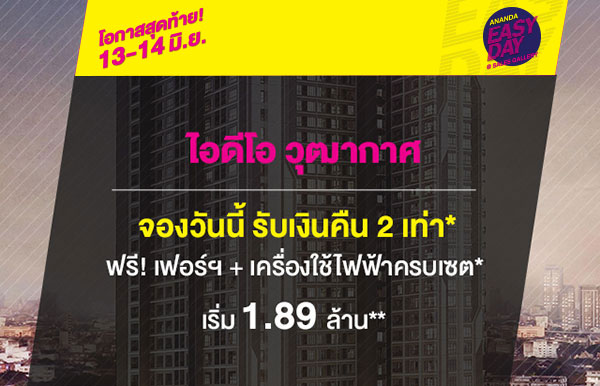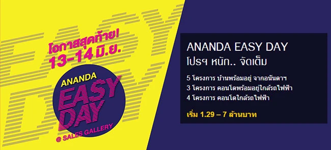 บริษัท อนันดา ดีเวลลอปเม้นท์ จํากัด (มหาชน) จัดโปรโมชั่น "Ananda Easy Day" โปรฯ ใหญ่ แรงทุกดีล ยกทัพบ้าน-คอนโดใกล้รถไฟฟ้า พร้อมอยู่ รวม 12 โครงการ 13 - 14 มิ.ย. นี้ เริ่ม 1.29 - 7 ล้านบาท ที่ Sales Gallery แต่ละโครงการ