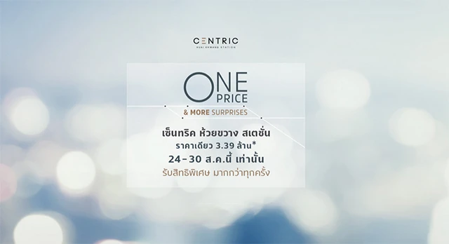 บริษัท เอสซี แอสเสท คอร์ปอเรชั่น จำกัด (มหาชน) มอบข้อเสนอสุดฮอต ในแคมเปญ One price and more surprises ด้วยการจัดยูนิตพิเศษราคาเดียว 3.39 ล้านบาท พร้อมสิทธิพิเศษมากกว่าทุกครั้ง ที่โครงการ เซ็นทริค ห้วยขวาง สเตชั่น (Centric Huai Khwang Station)  คอนโดมิเนียม แต่งครบ ทำเลใจกลางเมือง ริมถนนรัชดาภิเษก ติด MRT ห้วยขวาง ตั้งแต่วันนี้ - 30 สิงหาคม 2558 มาก่อนรับสิทธิ์ก่อน ที่ Sale Gallery โครงการ เซ็นทริค ห้วยขวาง สเตชั่น