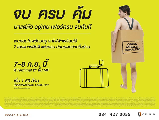 บริษัท ออริจิ้น พร็อพเพอร์ตี้ จำกัด (มหาชน) เตรียมจัดงาน "ORIGIN MISSION COMPLETE - มาแต่ตัว ... จบ ครบ คุ้ม" พบกับคอนโดพร้อมอยู่ ทำเลดี ที่จะทำให้การใช้ชีวิตของคุณ เพียบพร้อมทุกความสะดวกสบาย ตอบรับรูปแบบการใช้ชีวิตโดยนำคอนโดพร้อมอยู่ 7 โครงการคุณภาพ ในราคาเริ่มต้นเพียง 1.59 - 2.45 ล้านบาท พร้อมข้อเสนอพิเศษ...แบบจัดหนักจัดเต็ม "ฟรี ! ทุกรายการ ห้องแต่งครบ พร้อมส่วนลดกว่าครึ่งล้าน" เฉพาะภายในงานวันที่ 7-8 ก.ย. 58 นี้ ณ ลานโปรโมชั่น ชั้น MF ศูนย์การค้าเทอร์มินอล 21