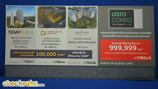 มาพร้อมโปรโมชั่นสุดพิเศษกับแคมเปญคอนโดนำ 4 คอนโด ทำเลสุดชิค ติดรถไฟฟ้า อาทิ เทมโป วัน รามคำแหง-พระราม 9, เดอะ เทมโป แกรนด์ สาทร-วุฒากาศ, เทมโป ควอด สะพานใหม่ และโครงการคอนโดมิเนียมน้องใหม่ "เลสโต (LESTO) สุขุมวิท 113" พบโปรโมชั่นสุดพิเศษสำหรับลูกค้าที่จองภายในงาน รับส่วนลดสูงสุด 100,000* บาท พร้อมลุ้นรับ iPhone 6S 16GB
