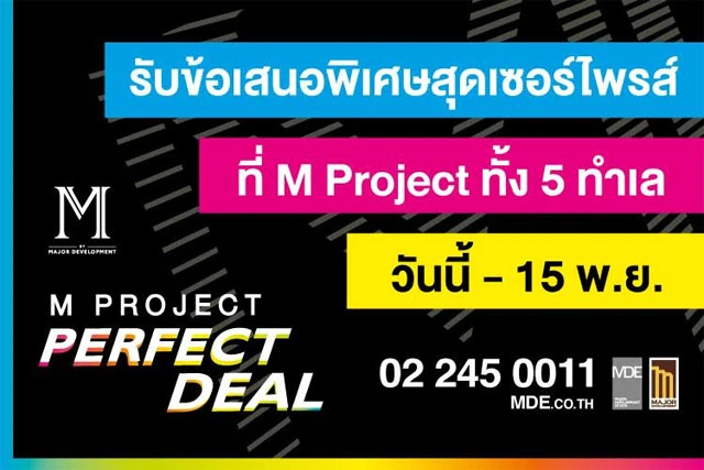 บริษัท เมเจอร์ ดีเวลลอปเม้นท์ จำกัด (มหำชน) ผู้พัฒนาคอนโดมิเนียมระดับไฮเอนด์ จัดโปรโมชั่นสุดพิเศษสำหรับผู้ที่กำลังมองหาคอนโดมิเนียม ทั้งเพื่อการอยู่อาศัย และเพื่อการลงทุน กับงาน "M PROJECT PERFECT DEAL (เอ็ม โปรเจ็ค เพอร์เฟค ดีล)" พบข้อเสนอพิเศษที่คุณจะปฏิเสธไม่ลง กับคอนโดมิเนียมทั้ง 5 ทำเลที่พร้อมให้คุณเป็นเจ้าของแล้ว ไม่ว่าจะเป็น เอ็ม สีลม (M Silom), เอ็ม พญาไท (M Phyathai), เอ็ม ลาดพร้าว (M Ladprao) ที่พร้อมเข้าอยู่ หรือจะเป็น เอ็ม จตุจักร (M Jatujak) และ เอ็ม ทองหล่อ 10 (M Thonglor Ten) ที่เป็นโครงการใหม่ และอยู่ระหว่างการก่อสร้าง ไม่ว่าคุณจะเลือกทำเลไหน ก็ได้รับข้อเสนอพิเศษไม่แพ้กัน ตั้งแต่วันนี้ ถึง 15 พฤศจิกายนนี้เท่านั้น ที่ Sale office ทั้ง 5 ทำเล