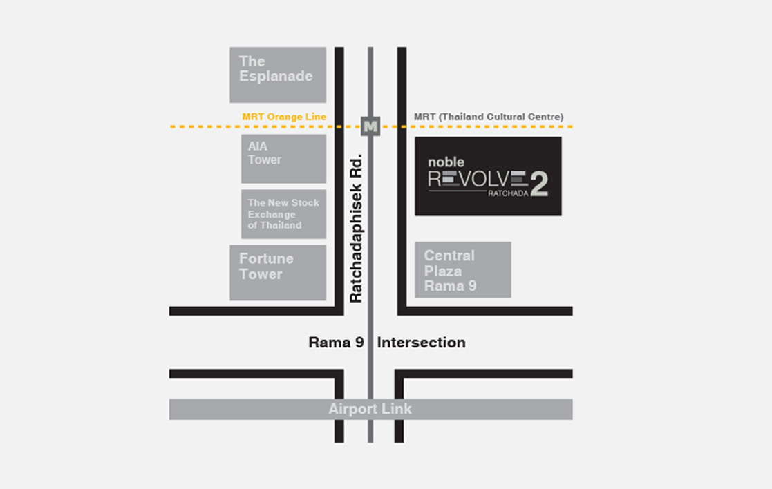 เมื่อเดือนธันวาคม 2558 ที่ผ่านมา ในเวลาไล่เลี่ยกับที่โครงการ Noble Revolve Ratchada 2 ได้รับ EIA นั้น โครงการรถไฟฟ้าสายสีส้ม ช่วงศูนย์วัฒนธรรมแห่งประเทศไทย-มีนบุรี ซึ่งมีสถานีเริ่มต้นคือสถานีศูนย์วัฒนธรรมแห่งประเทศไทย (ซึ่งจะตั้งอยู่ใต้โครงการคอนโด Noble Revolve Ratchada 2 เกือบพอดีเลย) ก็ได้รับความเห็นชอบจากคณะรัฐมนตรี (ครม.) ให้ รฟม. ดำเนินการเริ่มประมูลเช่นกัน ซึ่งหมายถึงว่าในที่สุดรถไฟฟ้าสายสีส้มช่วงตะวันออก (ศูนย์วัฒนธรรมแห่งประเทศไทย-มีนบุรี) ก็เริ่มมีเค้าลางของความเป็นจริงขึ้นมาแล้ว โดยสถานีศูนย์วัฒนธรรมแห่งประเทศไทยสายสีส้มนี้จะมีจุดตัดอยู่ที่ MRT สายปัจจุบันตรงสถานีศูนย์วัฒนธรรมแห่งประเทศไทยพอดี ทำให้ตรงจุดนี้มีแนวโน้มจะกลายเป็น Hub รถไฟฟ้าในอนาคตแบบเดียวกับที่บริเวณอโศกเป็นจุดตัดของ MRT และ BTS ในปัจจุบัน และจะทำให้คนที่อยู่อาศัยในคอนโด Noble Revolve Ratchada 2 มีความสะดวกสบาย และมีทางเลือกในการเดินทางมากขึ้น สมกับ Concept ของทางโครงการที่ว่า Noble Revolve Ratchada 2 เป็น "ไข่แดง (ศูนย์กลาง) รัชดาฯ" เลยค่ะ