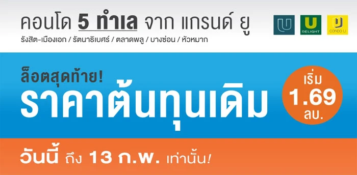 พบคอนโด 5 ทำเล กับ 7 โครงการคุณภาพจาก Grand U ล็อตสุดท้าย! ในราคาต้นทุน เริ่ม 1.69 ลบ.
