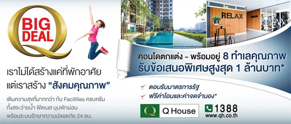 Q.House จัดแคมเปญ BIG DEAL คอนโดตกแต่งพร้อมอยู่ 8 ทำเล รับข้อเสนอพิเศษสูงสุด 1 ล้านบาท