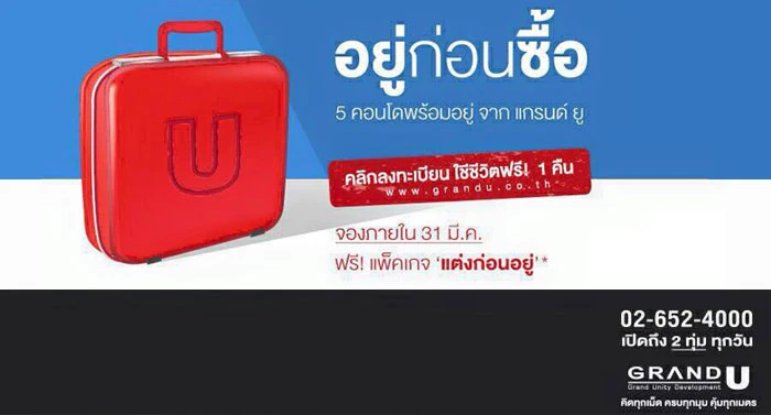 บริษัท แกรนด์ ยูนิตี้ ดีเวลล็อปเมนท์ จำกัด (แกรนด์ ยู) ท้าให้คุณลอง ใช้ชีวิตฟรี 1 คืน เพียง 3 ขั้นตอนง่ายๆ แค่ลงทะเบียน ในการสัมผัสห้องจริง วิวจริง กับคอนโด 5 โครงการพร้อมอยู่ จองภายใน 31 มี.ค. 59 ฟรี! แพ็คเกจ 'แต่งก่อนอยู่'