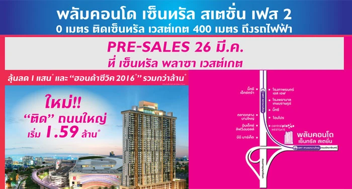 บริษัท พฤกษา เรียลเอสเตท จำกัด (มหาชน) เตรียมเปิด Pre-Sale พลัม คอนโด เซ็นทรัล สเตชั่น (Plum Condo Central Station) เฟส 2 ติดเซ็นทรัล เวสต์เกต ริมถนนรัตนาธิเบศร์ 400 เมตร ถึงสถานีรถไฟฟ้าสามแยกบางใหญ่ อำเภอบางใหญ่ จังหวัดนนทบุรี เริ่ม 1.59 ล้านบาท พร้อมลุ้นลด 1 แสน และฮอนด้าซีวิค 2016 รวมกว่าล้าน