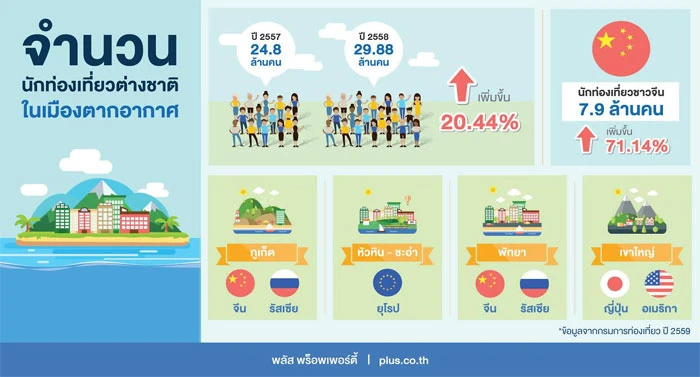 พลัส พร็อพเพอร์ตี้ ผู้เชี่ยวชาญด้านบริหารและจัดการอสังหาริมทรัพย์ครบวงจร เผยผลสำรวจ อสังหาริมทรัพย์ปี 2559 พบ คอนโดมิเนียมเมืองตากอากาศ พัทยา ภูเก็ต หัวหิน ชะอำ เขาใหญ่ เป็นเป้าหมายใหม่ดึงดูดนักลงทุน เป็นสินทรัพย์ความเสี่ยงต่ำให้ผลตอบแทน 2 ต่อ ทั้งกำไรจากมูลค่าที่เพิ่มขึ้นในระยะยาว และมีผลตอบแทนจากการปล่อยเช่า สอดคล้องกลุ่มนักท่องเที่ยวต่างชาติที่เดินทางเข้าประเทศไทยสูงขึ้นทุกปี ล่าสุดภาพรวมสุดคึกคัก อุปทานพื้นที่พัทยา 3.8 หมื่นยูนิต มีอุปสงค์ตอบรับแล้ว 82% ชะอำ-หัวหิน อุปทาน 7.4 พันยูนิต อุปสงค์ตอบรับ 73% ภูเก็ตอุปทาน 1.3 หมื่นยูนิต อุปสงค์ตอบรับ 68%