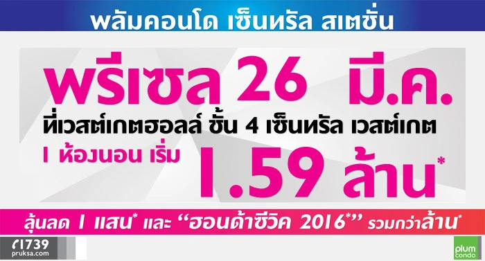 บริษัท พฤกษา เรียลเอสเตท จำกัด(มหาชน) เตรียม Pre-Sale พลัม คอนโด เซ็นทรัล สเตชั่น (Plum Condo Central Station) เฟส 2 คอนโดติดเซ็นทรัล เวสต์เกต ริมถนนรัตนาธิเบศร์ 400 เมตร ถึงสถานีรถไฟฟ้าสามแยกบางใหญ่ อำเภอบางใหญ่ จังหวัดนนทบุรี เริ่ม 1.59 ล้านบาท พร้อมลุ้นลด 1 แสน* และ Honda Civic 2016 รวมกว่าล้านบาท*
