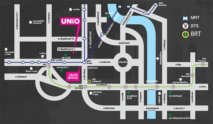 ผู้ที่สนใจสามารถเยี่ยมชมโครงการได้ที่ Sales Gallery โครงการ ยูนิโอ จรัญฯ 3 ใกล้สถานีรถไฟฟ้า ท่าพระ เพียง 900 เมตร ซึ่งเป็นสถานี Interchange ของสายบางซื่อ-ท่าพระ และสายหัวลำโพง-บางแค