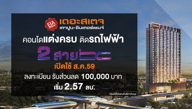 บริษัท เรียลแอสเสท ดีเวลลอปเม้นท์ จำกัด เปิดให้ลงทะเบียนโครงการ "เดอะ สเตจ เตาปูน อินเตอร์เชนจ์ (The Stage Taopoon Interchange)" คอนโดระดับ High Rise 36 ชั้น ตกแต่งครบ บนพื้นที่กว่า 3 ไร่ เพียงไม่กี่ก้าวจากจุดเชื่อมต่อของรถไฟฟ้าสองสาย ด่วน! ลงทะเบียนพร้อมรับส่วนลดถึง 100,000 บาท*