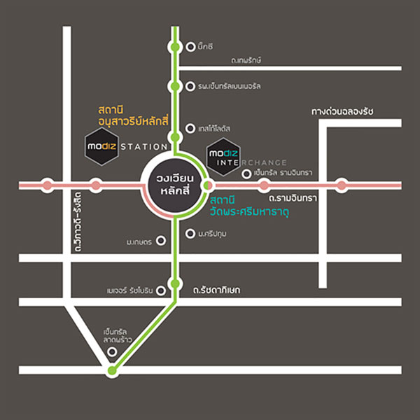 โมดิซ อินเตอร์เชนจ์ (Modiz Interchange) ทำเลติดถนนรามอินทรา และพหลโยธิน ติด BTS สถานีวัดพระศรีมหาธาตุ และสถานีเชื่อมต่อ (Interchange Station) ที่เชื่อมต่อระหว่าง BTS สายสีชมพูแคราย-มีนบุรี และ BTS สายสีเขียวส่วนต่อขยายหมอชิต-คูคต
