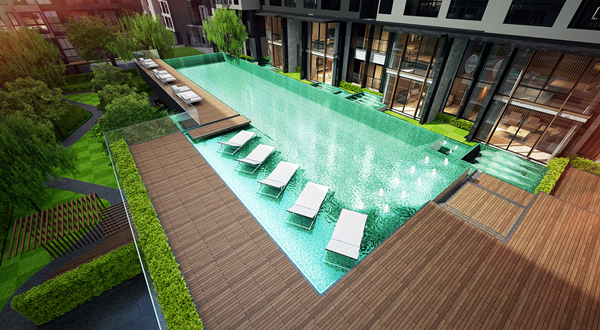 ภาพบรรยากาศจำลองบริเวณสระว่ายน้ำของโครงการ