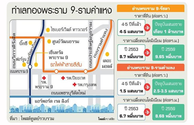 หากย้อนไปดูบริเวณพระราม 9-รัชดาที่มีรถไฟฟ้าใต้ดินผ่าน ได้รับความเจริญที่ขยายตัวมาจากฝั่งถนนสุขุมวิท ในช่วงปี 2550-2551 ที่ดินย่านรัชดาเสนอขายราวๆ 2 แสนบาท/ตร.ว. แต่คนซื้อยังไม่สูง เพราะยังหาซื้อในสุขุมวิทได้ จนราคาที่ดินสุขุมวิทวิ่งไปทะลุ 1.5 ล้านบาท/ตร.ว. ที่ดินรัชดาก็พุ่งตาม จนปัจจุบันพระราม 9-รัชดายกระดับไปมากแล้ว ราคาที่ดินวิ่งไปสูงแตะเกือบตารางวาละล้าน แต่ย่านนี้ก็ยังไม่ได้เกรดเอเท่าสุขุมวิท ส่วนใหญ่เป็นลูกค้ากลางบน จึงยากที่จะทำตลาดคอนโดมิเนียมราคาสูงๆ ใกล้เคียงกับสุขุมวิทได้