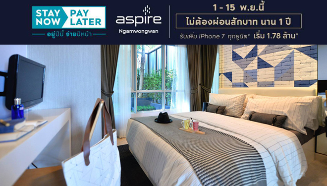 บริษัท เอพี (ไทยแลนด์) จำกัด (มหาชน) ส่งโปรฯ สุดคุ้ม ให้คุณอยู่ปีนี้ จ่ายปีหน้า "แอสปาย งามวงศ์วาน (Aspire Ngamwongwan)" ไม่ต้องผ่อนสักบาทนาน 1 ปี* วันที่ 1 - 15 พ.ย.นี้