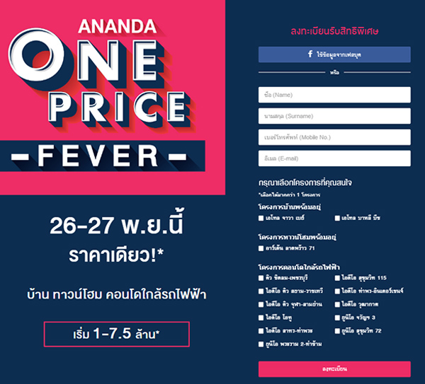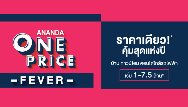 บริษัท อนันดา ดีเวลลอปเม้นท์ จำกัด (มหาชน) จัดโปรใหญ่ท้ายปี "Ananda One Price Fever" ยกขบวนคอนโดใกล้รถไฟฟ้า ในราคาเริ่มต้น 1 - 7.5 ล้าน* พบกัน 26 - 27 พ.ย.นี้ ราคาเดียวสุดคุ้มแห่งปี* ลงทะเบียนรับสิทธิพิเศษได้แล้ววันนี้