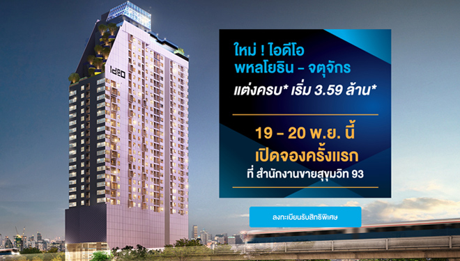 "ไอดีโอ พหลโยธิน-จตุจักร" เปิดจองครั้งแรก 19 - 20 พ.ย. นี้ ที่สำนักงานขายสุขุมวิท 93 สำหรับท่านใดที่สนใจสามารถลงทะเบียนเพื่อรับสิทธิพิเศษได้ที่ลิงก์ด้านล่างนี้