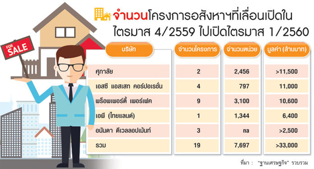 ทั้งนี้ จากการรวบรวมของ "ฐานเศรษฐกิจ" พบว่า บริษัท ศุภาลัย จำกัด (มหาชน) มีการเลื่อนเปิดโครงการอย่างเป็นทางการจาก Q4/2559 ไป Q1/2560 โดยเป็นคอนโดมิเนียม จำนวน 2 โครงการ ประกอบด้วย โครงการศุภาลัย เวอเรนด้า พระราม 9 มูลค่าโครงการ 4,000 ล้านบาท และโครงการศุภาลัย โอเรียนทัล สุขุมวิท 39 มูลค่าโครงการ มากกว่า 7,500 ล้านบาท