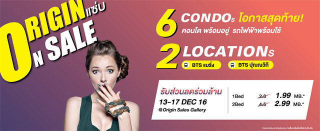 เตรียมพบกับมหกรรมลดกระหน่ำโอกาสสุดท้าย!! กับคอนโดคุณภาพเยี่ยม ติดสถานีรถไฟฟ้า 2 ทำเล สถานีแบริ่ง และ สถานีปุณณวิถี ล่าสุดบอสใหญ่ คุณพีระพงศ์ จรูญเอก ประธานเจ้าหน้าที่ บมจ. ออริจิ้น พร็อพเพอร์ตี้ เตรียมเอาใจลูกค้าในช่วงโค้งสุดท้ายของปี จัดมหกรรมลดกระหน่ำกับแคมเปญ "Origin แซ่บ On Sale" นำโครงการคอนโดฯ คุณภาพพร้อมอยู่ ติดสถานีรถไฟฟ้ากว่า 6 โครงการ จัดโปรโมชั่นพิเศษ อาทิ โครงการ บีรีพับบลิค สุขุมวิท 101/1, โครงการพอส สุขุมวิท 107, โครงการบีลอฟ สุขุมวิท 109 เป็นต้น ในราคาเริ่มต้นเพียง 1.59 ลบ. พิเศษสุดๆ !! รับส่วนลดร่วมล้านบาท สำหรับลูกค้าที่จอง+ทำสัญญาภายในงาน จ่ายในราคา 1 ห้องนอน แต่ได้ถึง 2 ห้องนอน (เงื่อนไขตามบริษัทฯ กำหนด) โดยงานจะจัดขึ้นในวันที่ 13-17 ธ.ค. นี้  ณ Origin Sales Gallery