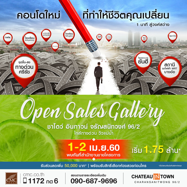 CMC Group โดยบริษัท พระยาพาณิชย์พร็อพเพอร์ตี้ จำกัด อีกหนึ่งบริษัทในเครือ บริษัท เจ้าพระยามหานคร จำกัด (มหาชน) เปิดตัวคอนโดใหม่ ชาโตว์ อินทาวน์ จรัญสนิทวงศ์ 96/2 ในงาน Open Sales Gallery วันที่ 1-2 เมษายน นี้ ณ สำนักงานขายโครงการ โดยลูกค้าที่จองภายในงานจะได้รับสิทธิ์เลือกห้องสวยก่อนใคร ในราคาพิเศษ เริ่มต้น 1.75 ล้านบาท* และยังผ่อนต่อเดือนเพียงแค่ 4,900 บาท* เท่านั้น พิเศษลงทะเบียนรับส่วนลด 50,000 บาท