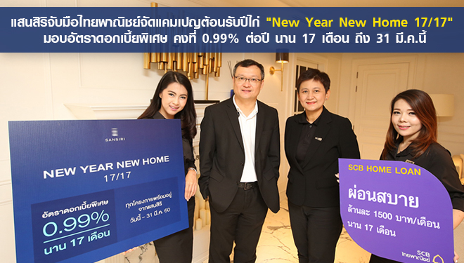 คุณอุทัย อุทัยแสงสุข (ที่ 2 จากซ้าย) รองกรรมการผู้จัดการอาวุโสสายงานพัฒนาธุรกิจและพัฒนาโครงการคอนโดมิเนียม บริษัท แสนสิริ จำกัด (มหาชน) และคุณกนกวรรณ ใจศรี (ที่ 2 จากขวา) ผู้ช่วยผู้จัดการใหญ่ ผู้บริหารสายสินเชื่อเพื่อที่อยู่อาศัย ธนาคารไทยพาณิชย์ ร่วมกันจัดแคมเปญแรงต้อนรับปีระกา "New Year New Home 17/17" ให้ลูกค้าได้มีบ้านใหม่รับปีใหม่ ด้วยการมอบสินเชื่อบ้าน อัตราดอกเบี้ยพิเศษ คงที่ 0.99% นาน 17 เดือน ผ่อนสบายเพียงล้านละ 1,500 ต่อเดือน นาน 17 เดือน เมื่อซื้อโครงการพร้อมอยู่ของแสนสิริทุกโครงการ และใช้สินเชื่อบ้านไทยพาณิชย์ เริ่มมอบความคุ้มค่าตั้งแต่วันนี้จนถึงวันที่ 31 มีนาคม 2560